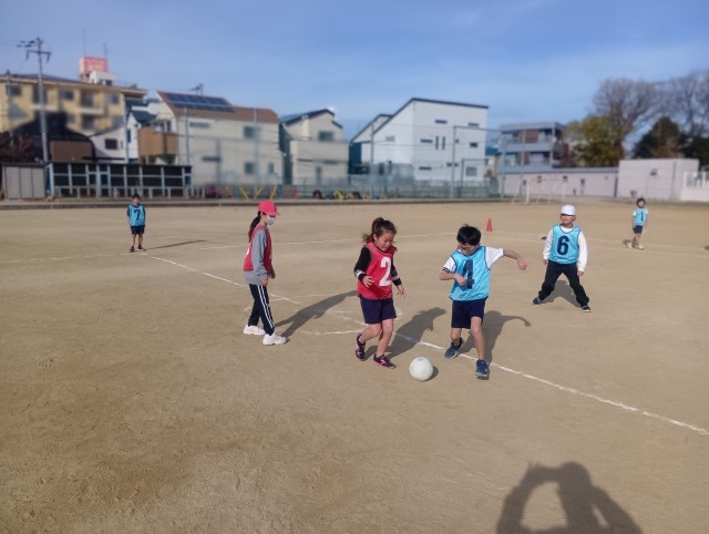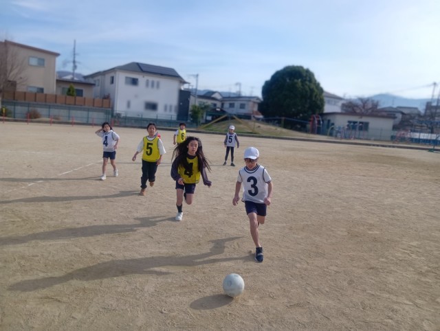 体育のラインサッカー。白熱した試合が続きます。最近、勝ち負けについて拘る子が少なくなってきています。勝ち負けより楽しむことに夢中のようです。