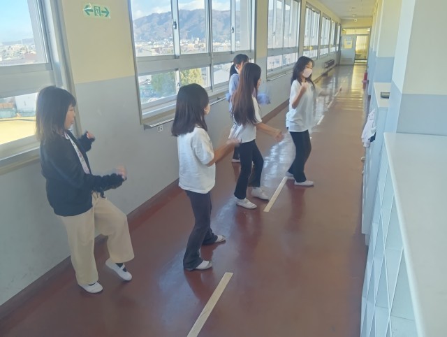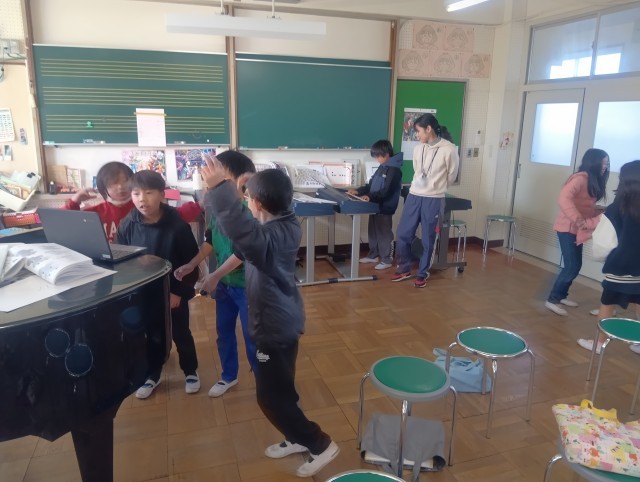 音楽の時間、からだを使ったリズム表現。とても上手なグループやコミカルな動きのグループもありとても楽しそうです。