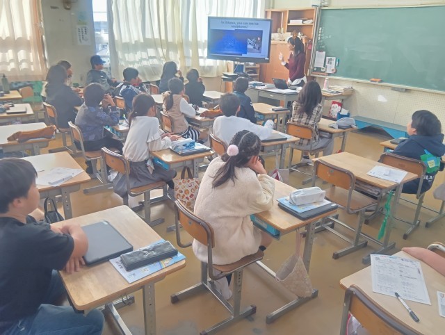 外国語の時間、AETの先生の出身地カナダの冬についての紹介がありました。大きな川でスケートしているスライドにびっくりの子どもたち。