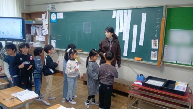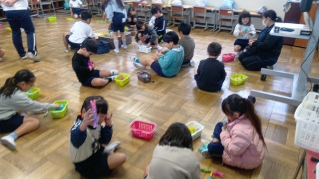 図工の時間、洗濯ばさみを使った造形遊び。丸くつないだり何かの形をつくったり思い思いの形に仕上げていました。