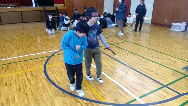 アイマスク体験では「怖いー」の声があちこちから聞こえてきました。