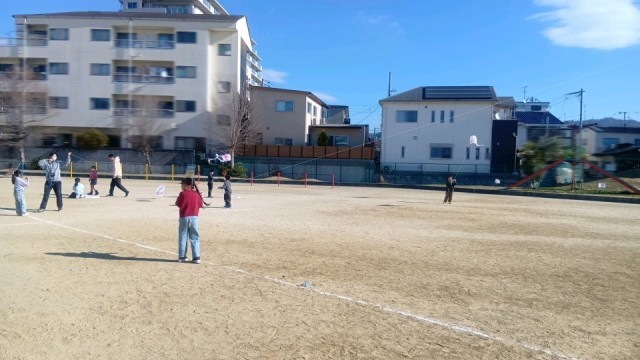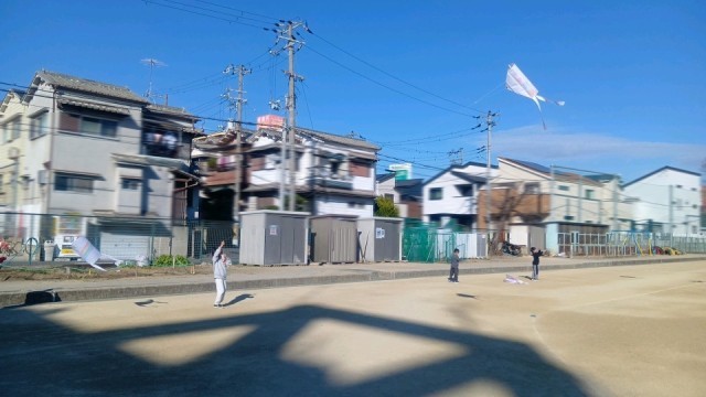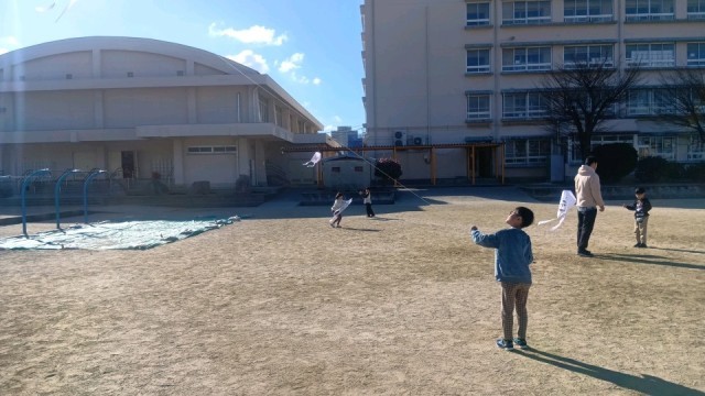 今日は風が強いため絶好の凧揚げ日和。ぐんぐん上がる凧、震える大人たち…。子どもたちは目いっぱい楽しんでいました。