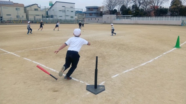 体育の時間、ティーボールをしていました。中には鋭い打球でホームランを打つ子も。皆でワチャワチャ楽しそうでした。
