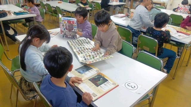 図書の時間、いろんな本を読む子どもたち。子どもに大人気の図鑑シリーズを読んでいる子がたくさんいました。「国宝」シリーズがあるのを初めて知りました。