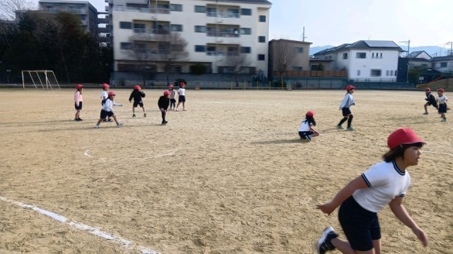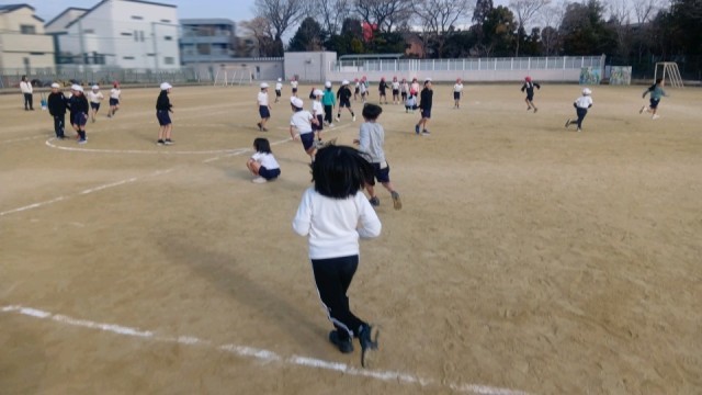 運動場で合同体育。クラス対抗「イルカの親子」で大いに盛り上がっています。