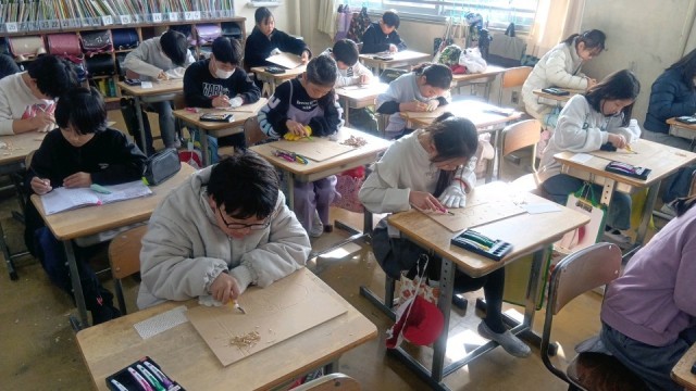 図工で彫刻刀を扱っていました。全員が安全な彫り方で集中して取り組んでいました。