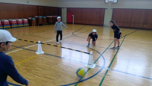 体育の時間、バレーボール型のゲームを楽しむ子どもたち。ゲーム性を理解し実践できる子どもたちが増えてきました。こうなると楽しいですよね。