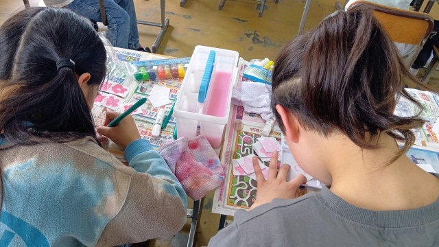 4年生の図工では、桜の花びらを作っていました。