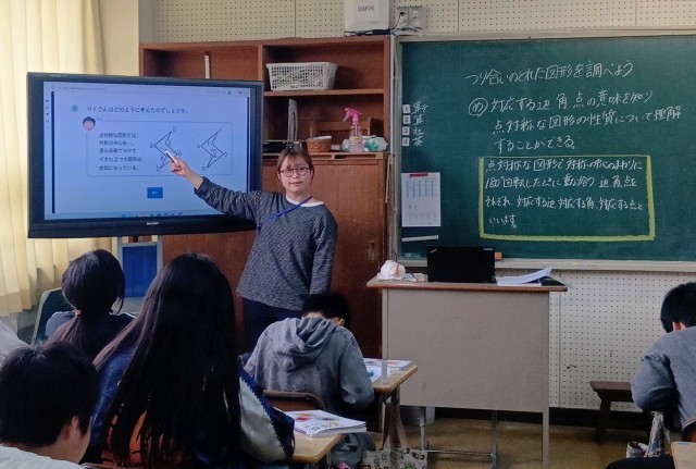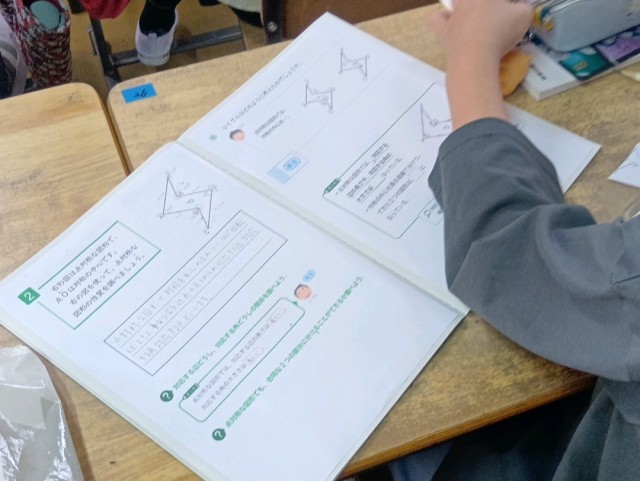 実際に図形を操作して辺や角の重なりなどを調べ、点対称な図形の性質をみんなで確認しました。
