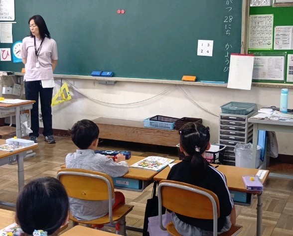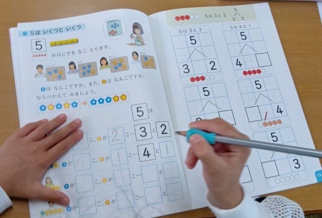 5このおはじきから、先生がいくつか取って、みんなに「黒板には2つあります。先生の手の中には、おはじきはいくつあるでしょう」と聞くと、1年生のみんなが元気に「3つ!」と答えていました。