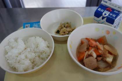 今日の献立は、かつお和え、ちゃんこ煮、ご飯、ふりかけ、牛乳です。