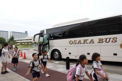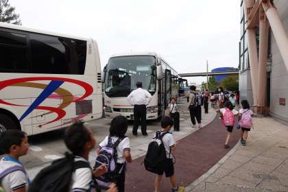 到着は、渋滞のため少しだけ遅れました。子どもたちはワクワクしています。