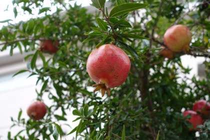 学校の中庭や玄関横には、こんな実がなっています。オリーブ、花梨、ザクロです。