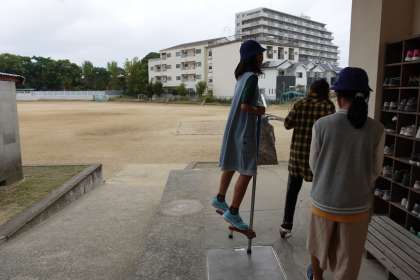昔遊びです。雨が降っているので、渡り廊下で練習です。