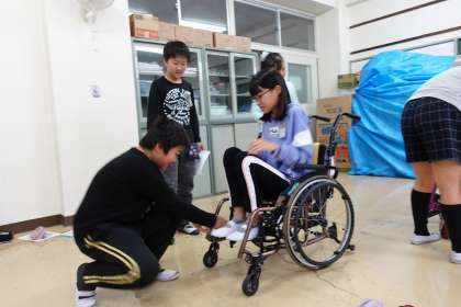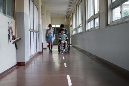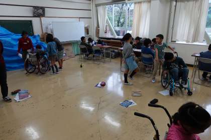 川村義肢株式会社様より車いすをお借りし、校内で5年生が車いす体験をしました。
