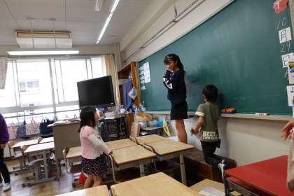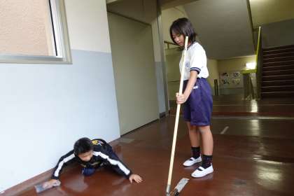 今日もきらきら清掃交流です。1年の教室に、何名か6年生が来てくれました。