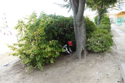 暑くもなく寒くもなく、いい季節です。かくれんぼで、「秘密基地」にかくれている人を見つけました。