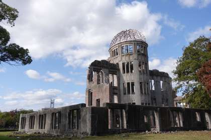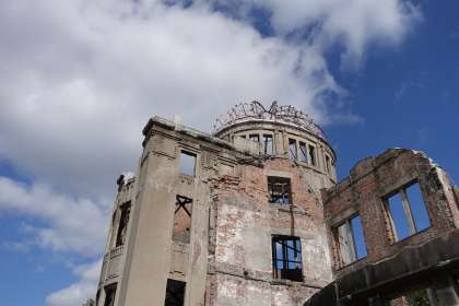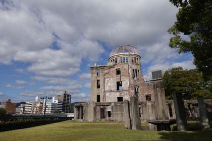 原爆投下当時は広島県産業奨励館と呼ばれていた建物ですが、爆心地から北西約160メートルの至近距離で被爆し、爆風と熱線を浴びて大破し、天井から火を吹いて全焼しましたが、爆風が上方からほとんど垂直に働いたため、本屋の中心部は奇跡的に倒壊を免れたそうです。