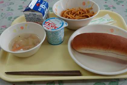今日の献立は、ヨーグルト、ベビーパン、スパゲティミートソース、野菜スープ、牛乳です。