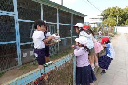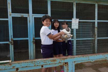 とてもおとなしいラピです。飼育委員に抱っこされ、たいへんおとなしくしています。「ふわり」のほうは飼育委員が近づくと、抱っこが嫌なのか逃げ回っていました。