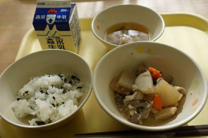 今日の献立は、わかめご飯、けんちん煮、すまし汁、牛乳です。わかめご飯は人気があります。