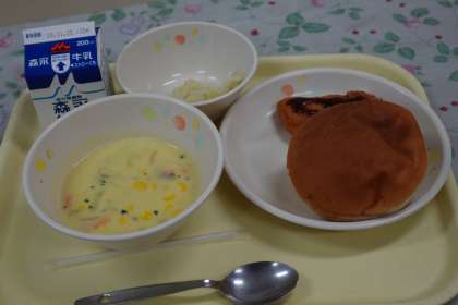 今日の献立は、白身魚のフライ、キャベツソテー、コーンクリームスープ、バーガーパン、牛乳です。