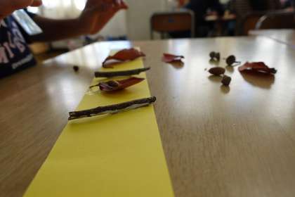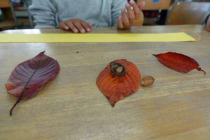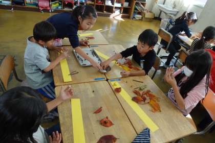 2年2組と3組が、図工の授業を行っていました。作品名は「秋のかんむり」です。