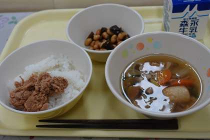 今日の献立はきりたんぽ風、ご飯、かつおそぼろ、昆布豆、牛乳です。特に、きりたんぽ風は、削りぶしのうまみにこだわって調理していただいています。「だし」のうまみを味わいましょう。