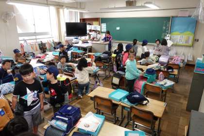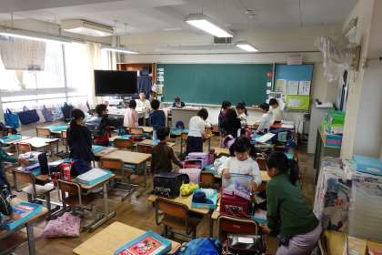 朝の準備をする1年生です。
