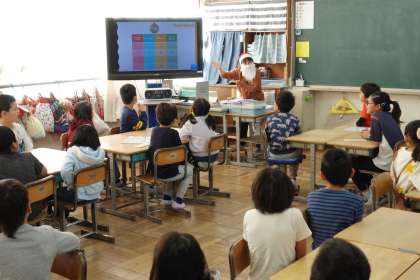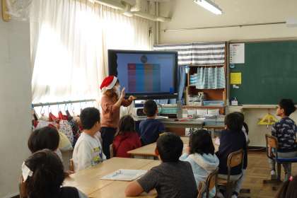 3年生の外国語活動です。サンドラ先生がサンタクロースになっていますよ。