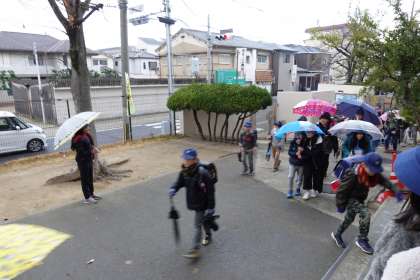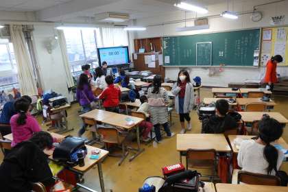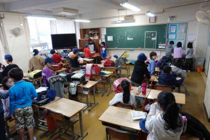 登校時、急に雨が降ってきました。写真は朝の準備をする4年生です。4年1組は、また撮影に失敗してしまいました。