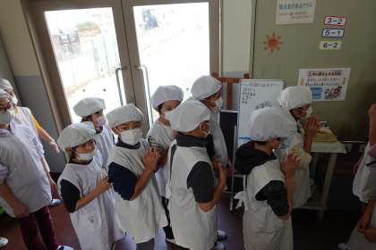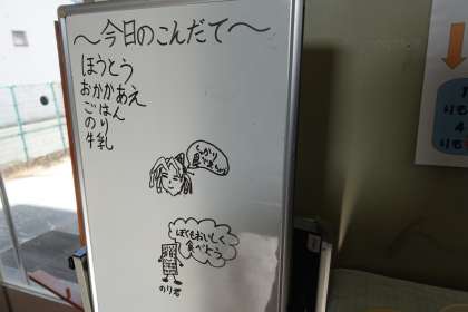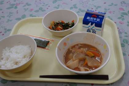 今日の献立は、おかか和え、ほうとう、ご飯、のり、牛乳です。