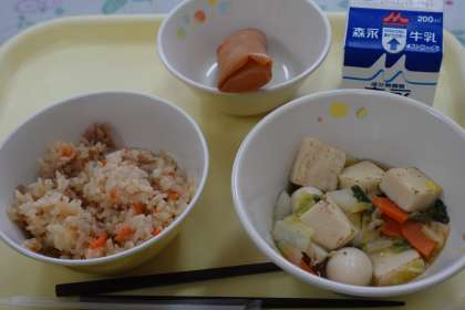 今日の献立は、春巻き、ぎゅうん中華風かやくご飯、青菜のさっぱり炒め、牛乳です。