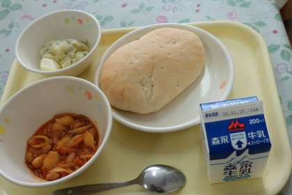 今日の献立はオリーブパン、チリコンカーン、じゃがバター、牛乳です。新メニューのオリーブパンはとてもおいしかったです。