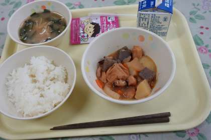 今日の献立は、関東煮、みそ汁、ご飯、ふりかけ、牛乳です。