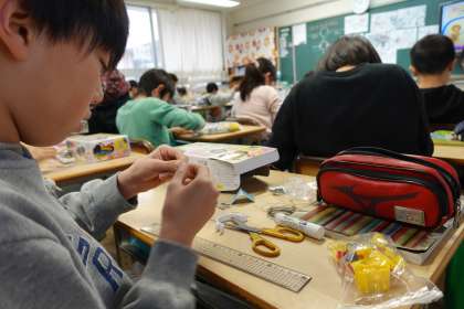 理科の授業です。コイルを巻いているようです。
