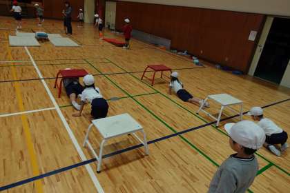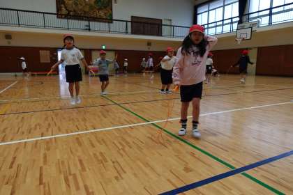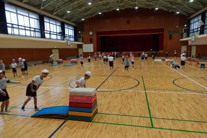 1年生の体育です。遊びの要素が入ったサーキットトレーニングを行っていました。