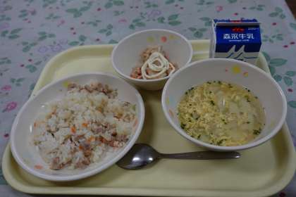 今日の献立は、ハムピラフ、卵スープ、切り干し大根サラダ、牛乳です。