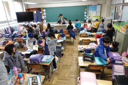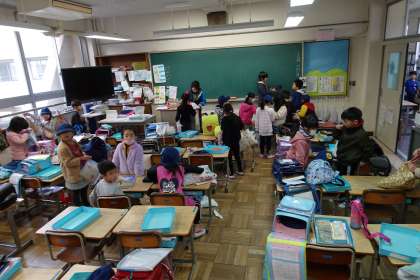 朝の準備をする1年生です。この土日のことを、たくさん教えてくれました。