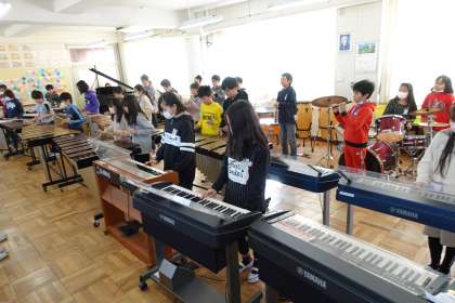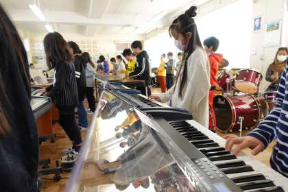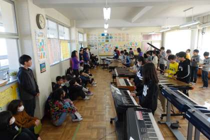 音楽室では、6年3組と5年3組が合同音楽の授業を行っていました。5年生の演奏を聞いて、6年生がアドバイスをしてくれています。