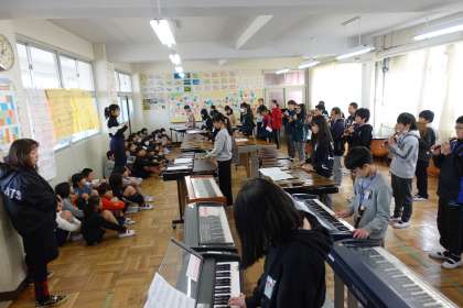 6年2組と5年2組の合同音楽です。6年生の演奏を聴いて、5年生が色々感じたことを伝えます。