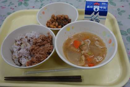 今日の献立は五目豆、かつおそぼろ、十六穀ご飯、豚汁、牛乳です。