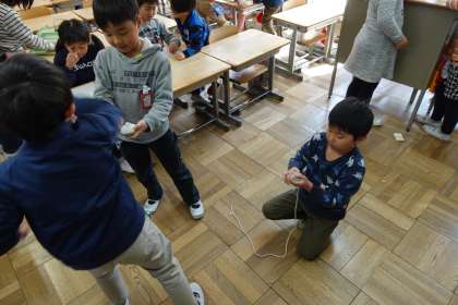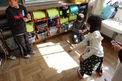 今日は外で遊べないので教室で過ごしています。こま回しが1年生のブームみたいですね。