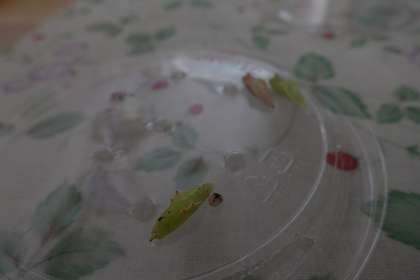 アオムシがさなぎになりました。3年生の先生に聞くと、多くのアオムシが寄生虫などの原因でさなぎになれなかったそうです。