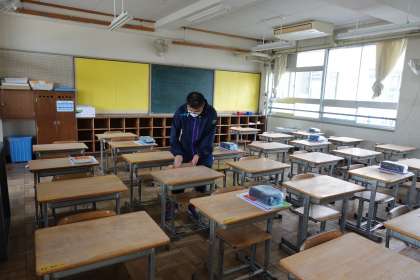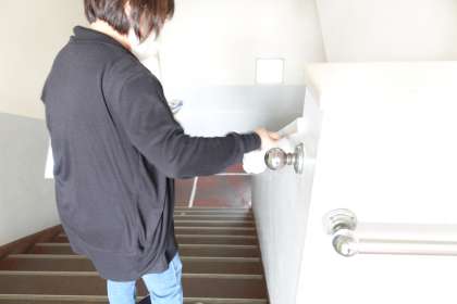 明日からの分散登校に向けて準備中です。教室内や廊下の手すりを消毒しています。