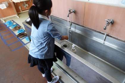 教室に入る前の手洗い指導です。今後も手洗いについては、徹底して指導します。写真は1年生です。