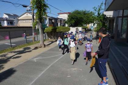 今日は氷野3丁目、レスタージュ、御領2丁目の登校日です。日差しがまぶしいです。