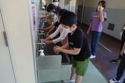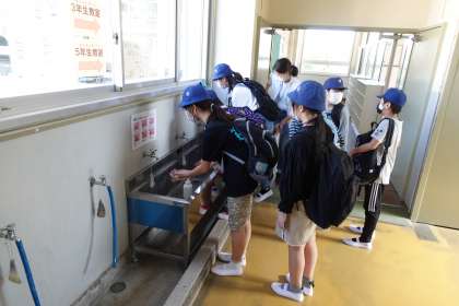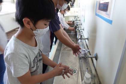 教室に入る前の手洗いです。みんな手洗いが上手です。