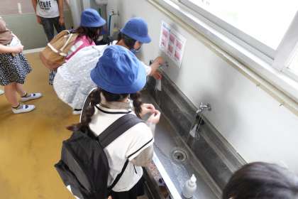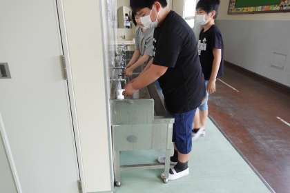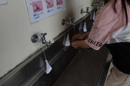教室に入る前の手洗いです。みんなしっかり手洗いしています。