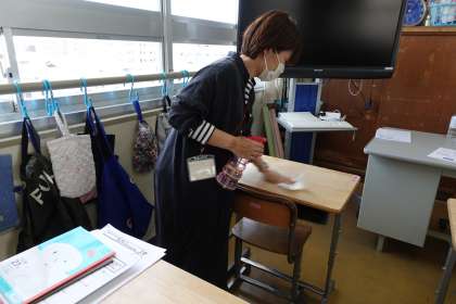 子どもたちが下校した後、先生たちが消毒をしています。学校における「新しい生活様式」なのかもしれませんが、確実に定着しました。
